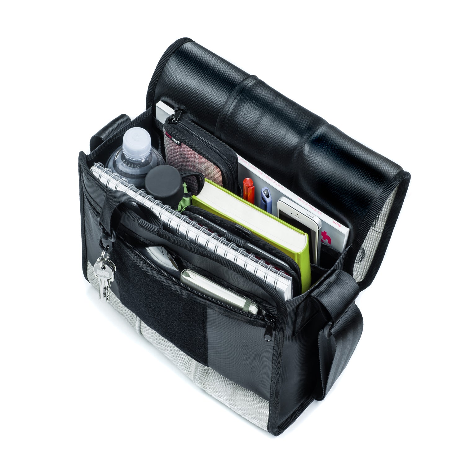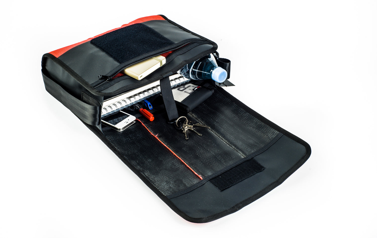 - Ausstattung außen: längenverstellbarer Tragegurt, großes Reissverschlussfach (Din A5), Klettverschluss